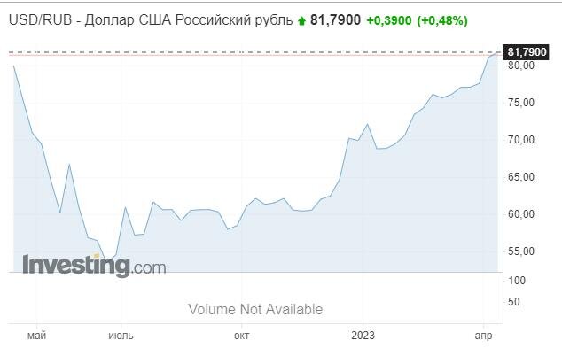 Если посмотреть на курс рубля к доллару в разрезе года, то мы можем увидеть, что сейчас он находится точно на том же уровне, что и был в апреле 2022 года.